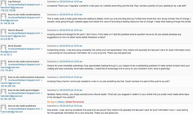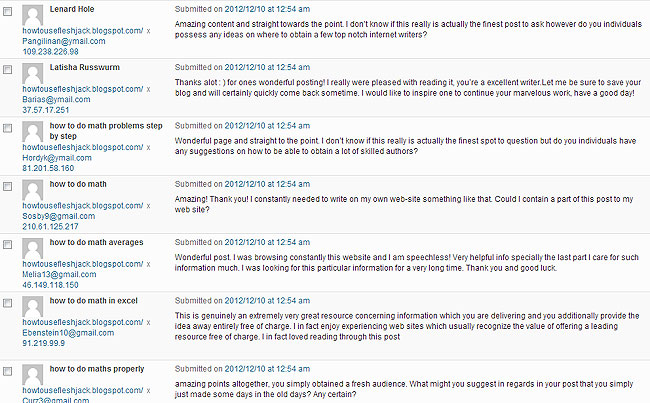 Anyway. This post is about that extra-special type of blog spam that I’m almost grateful for because it’s so entertaining, so packed full of phrases that you could put on hipster t-shirts, making them even more stupid. It’s the spam designed to look like it’s from a real reader, if your real readers are (1) creepy, (2) not native speakers of your language and (3) use Google Translate to tell you how much they like your blog. This kind of spam is the primary reason my blog’s settings make all first-time commenters go straight to moderation. I feel bad when it snags nice normal new readers but let me show you why it’s necessary. Here are several that my Akismet filter caught this morning, all at exactly 12:54 a.m., all linking back to the same website, and each with a different fake email address and a different IP address.
