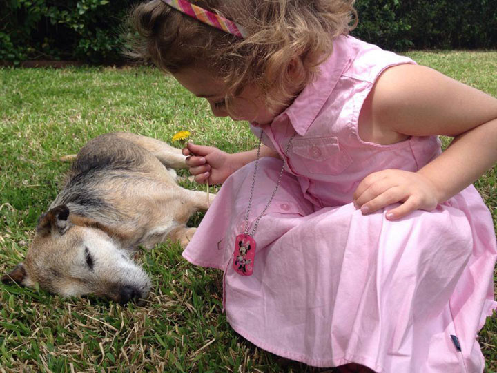 That was 8 months ago and they hadn’t seen each other since, but Hay’s mother tells me the kid talks about “Peemo” all the time. So when we finally had Hay over this weekend while my sister (her grandmother) was here visiting from out of state, it was love renewed. Primo resumed his gaze of admiration, and nearly ripped Firefly’s throat out when she barked at Hay. But it was a hot day so after a few hours, he was crashed out in the shady grass, which must have made Hay think he didn’t love her anymore so she picked a dandelion (I told her it was a “pretty flower” – kid can learn the truth when she’s older) and offered it to him. He sat up for a minute to sniff the bounty…