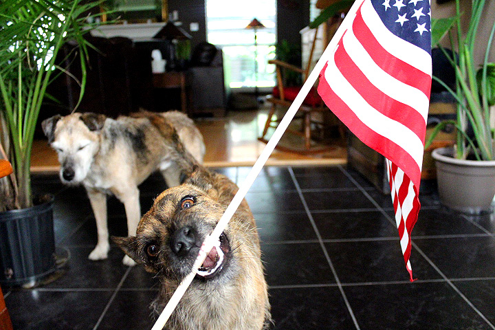 Firefly, the native-born dog, is celebrating the nation’s birthday with enthusiasm and teeth. Primo, the Italian, is still not completely accustomed to the ways of our people.
