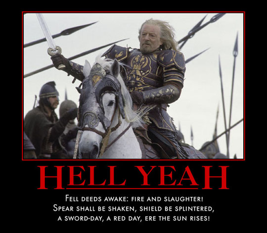 And I’m with DaveW here; I thought Theoden’s speech and his glorious charge were way better than Aragorn’s speech. Though his didn’t suck either. Rachel, I love the Theoden motivator poster!!